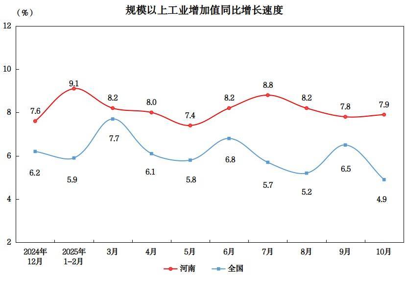 【大河财立方消息】11月15日,河南省统计局发布数据显示,10月份,全省规模以上工业增加值同比实际增长7.9%(增加值增速均为扣除价格因素的实际增长率),高于全国3.0个百分点;1-10月份,规模以上工业增加值同比增长8.4%,高于全国2.3个百分点。