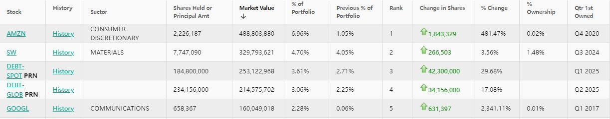 在前五大重仓股中,亚马逊(AMZN.US)位列第一,持仓约222.6万股,持仓市值约4.89亿美元,占投资组合比例为6.96%,持仓数量较上季度大幅增长481.47%。