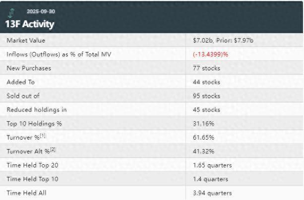 据统计,该基金第三季度持仓总市值为70.2亿美元,上一季度总市值为79.7亿美元,环比减少13%。该基金在第三季度的持仓组合中新增了77只个股,增持了44只个股。同时,该基金减持45只个股,清仓95只个股。其中,前十大持仓标的占总市值的31.16%。